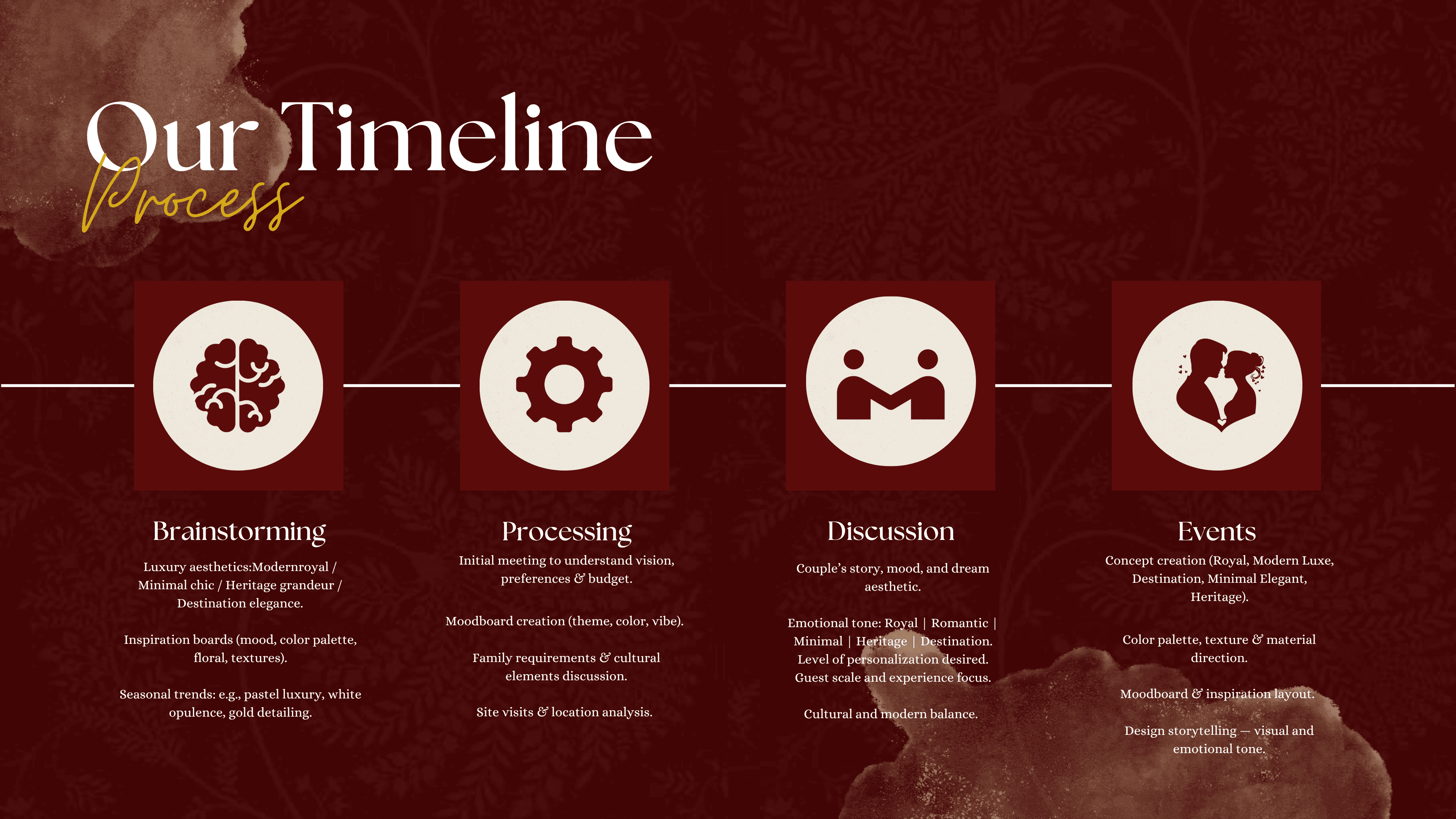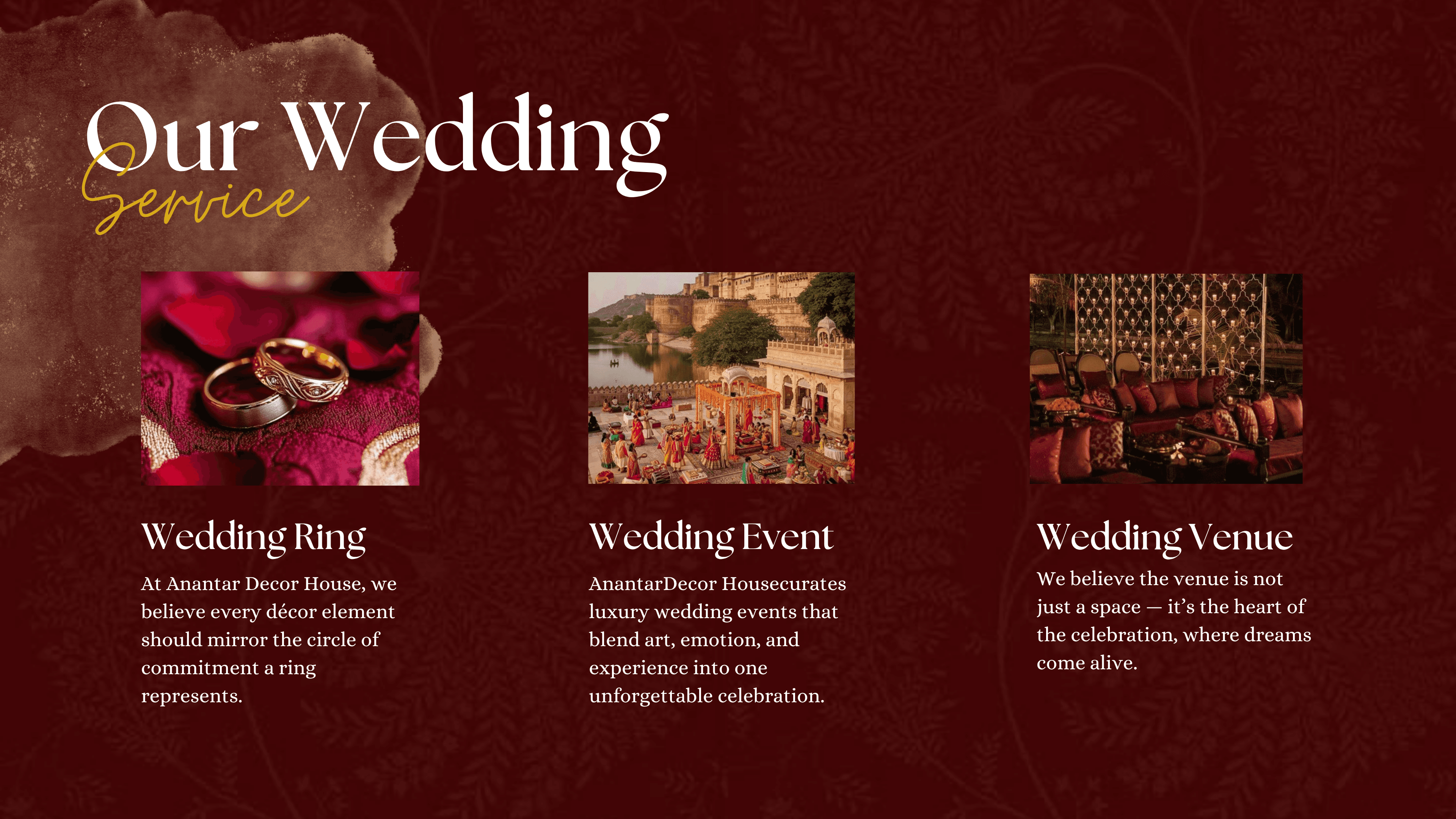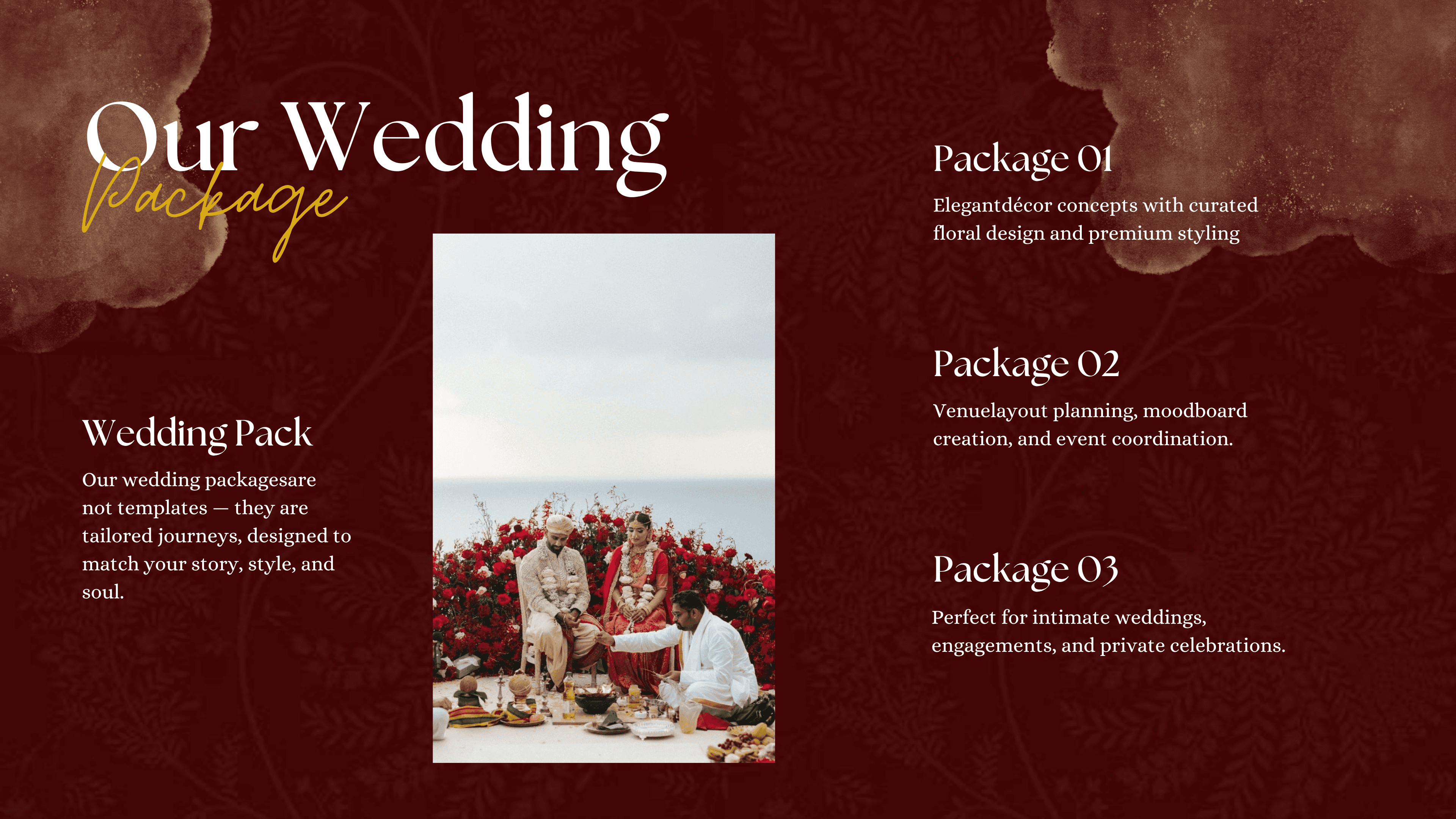 we design luxury weddings and elegant events with a blend of art, heritage, and modern style. Our bespoke décor transforms every celebration into a timeless and unforgettable experience.