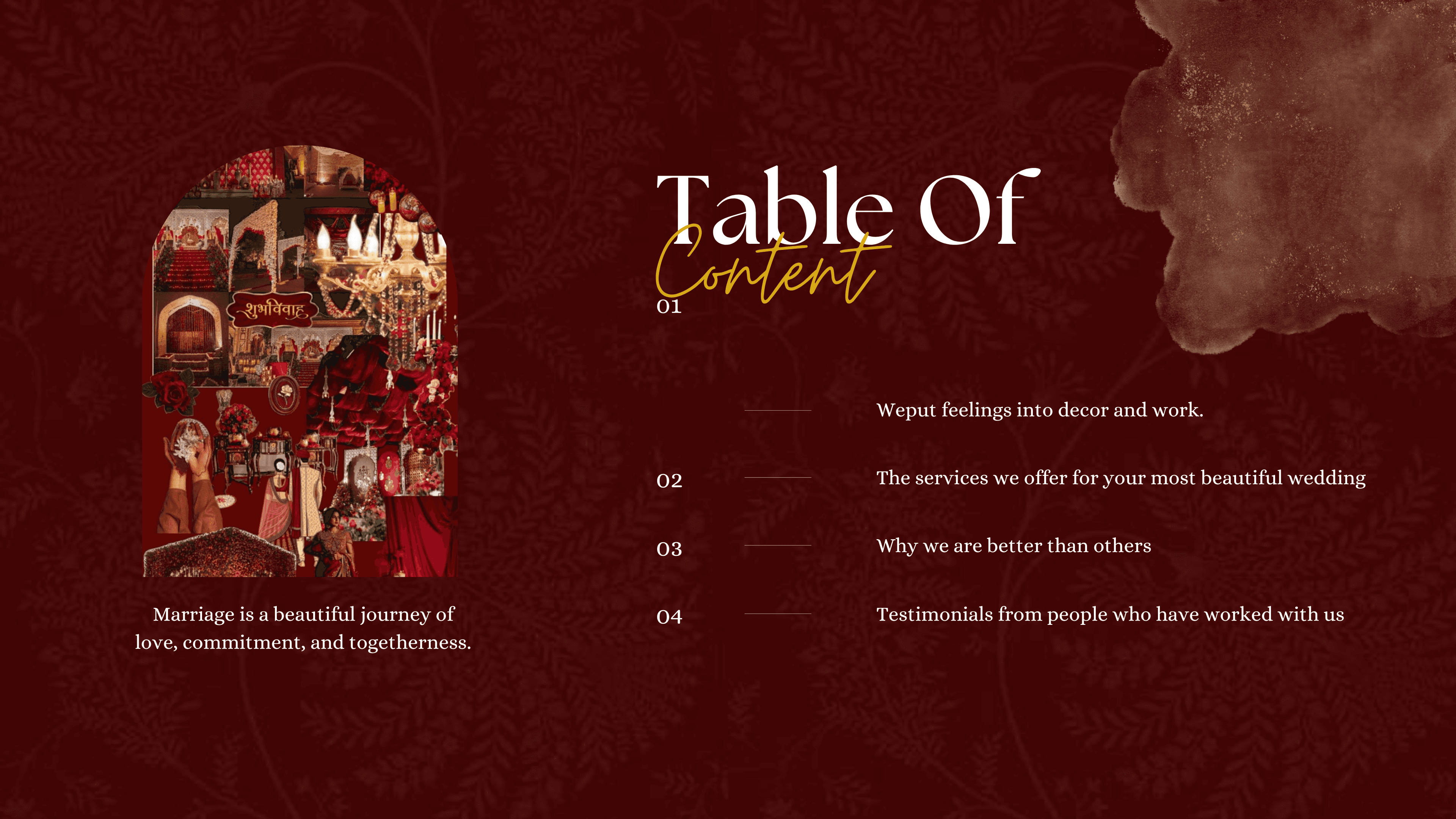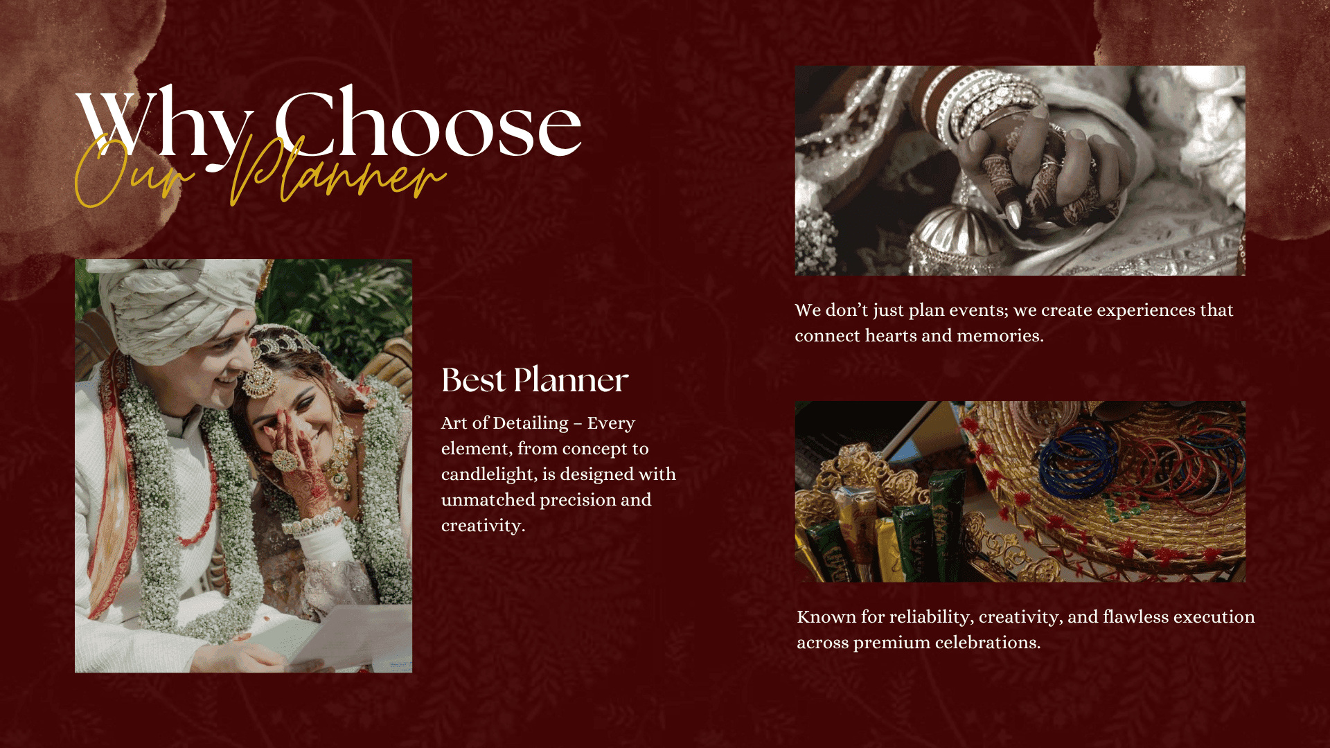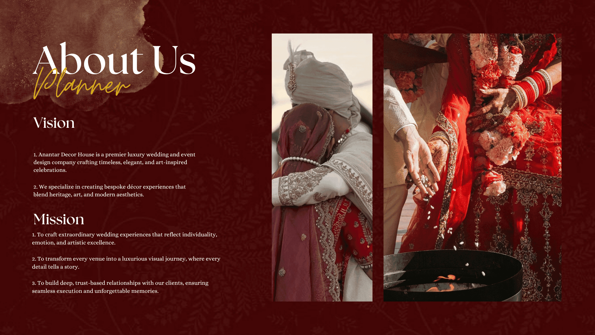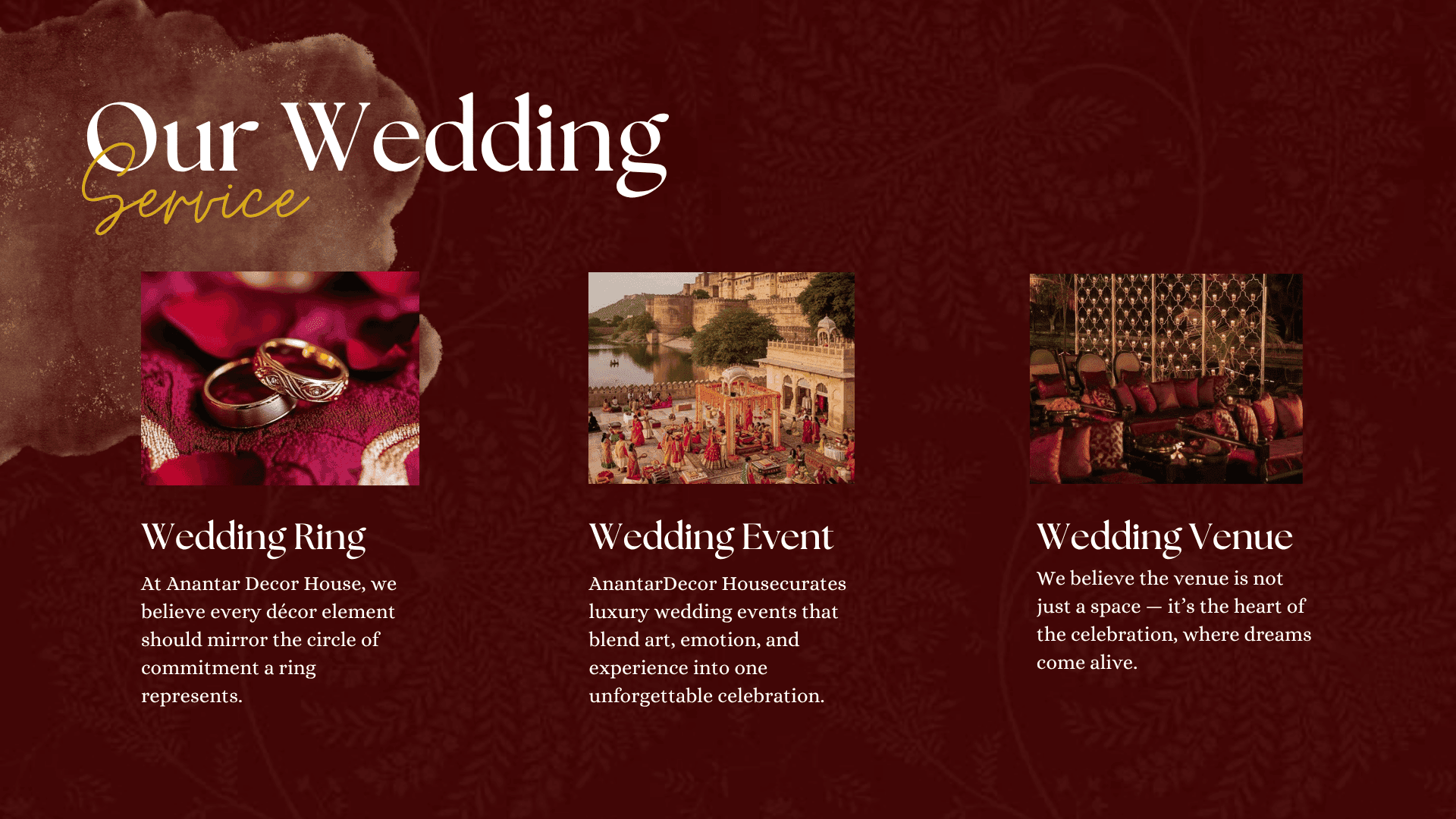 we design luxury weddings and elegant events with a blend of art, heritage, and modern style. Our bespoke décor transforms every celebration into a timeless and unforgettable experience.